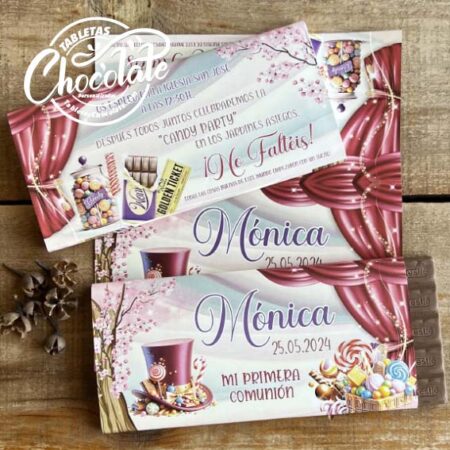 Invitación Tableta Chocolate Comunión Buble. Diseño niña comunión