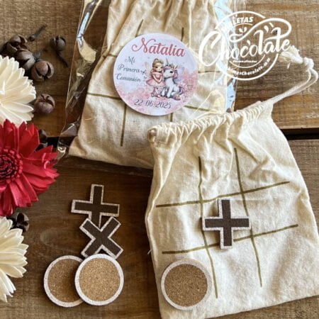 Presentado en bolsa de algodón con cierre de cordón que sirve como tablero para jugar.
